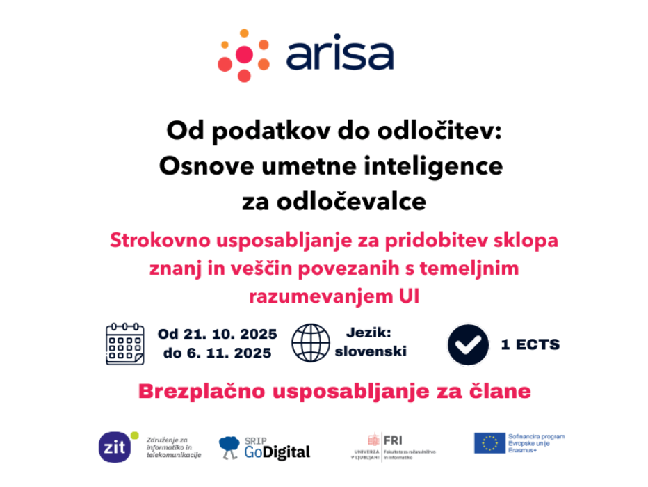 Le ta izvedba usposabljanja Od podatkov do odločitev: Osnove umetne inteligence za odločevalce bo brezplačna za člane Združenja za informatiko in telekomunikacijo.